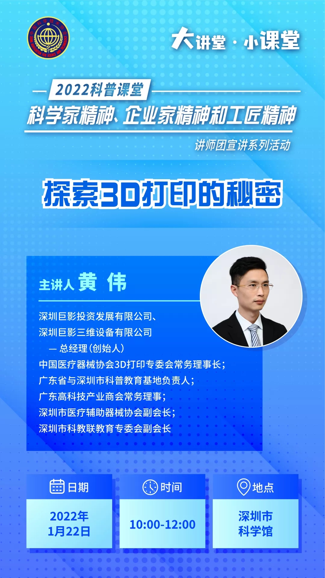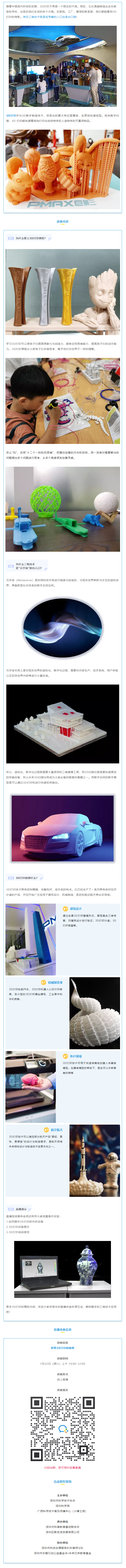 由於(yu) 疫情防控,深圳市科協企業(ye) 家精神科普講師團成員,深圳巨影投資發展有限公司、深圳巨影三維設備有限公司總經理(創始人)黃偉(wei) 老師將為(wei) 市民帶來“探索3D打印的秘密”主題線上直播科普公益大講堂。