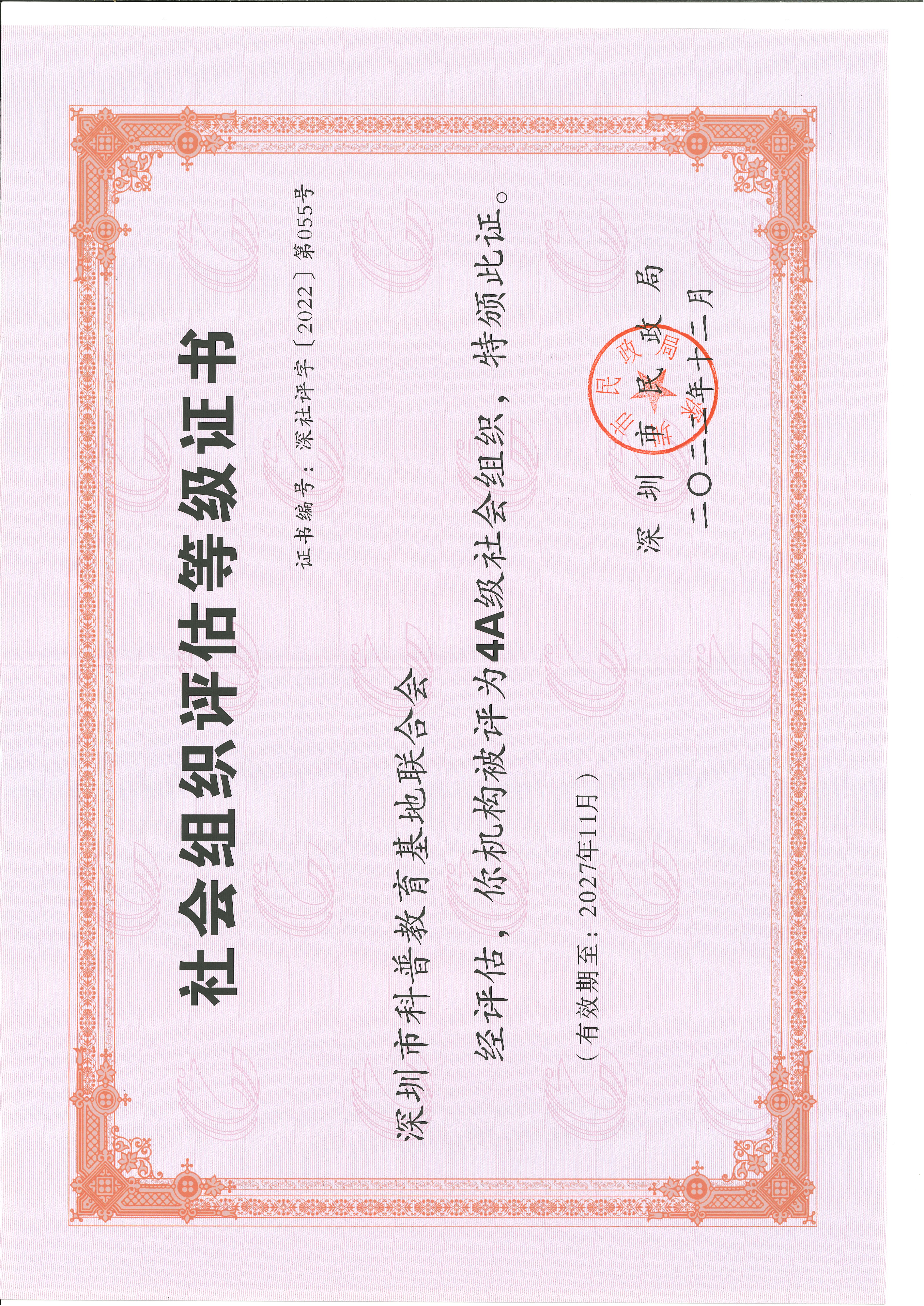 2022年12月,星空体育中国榮獲深圳市社會(hui) 組織總會(hui) 授予的“4A級社會(hui) 組織”光榮稱號,成為(wei) 深圳科普單位唯一獲此殊榮的行業(ye) 協會(hui) 。