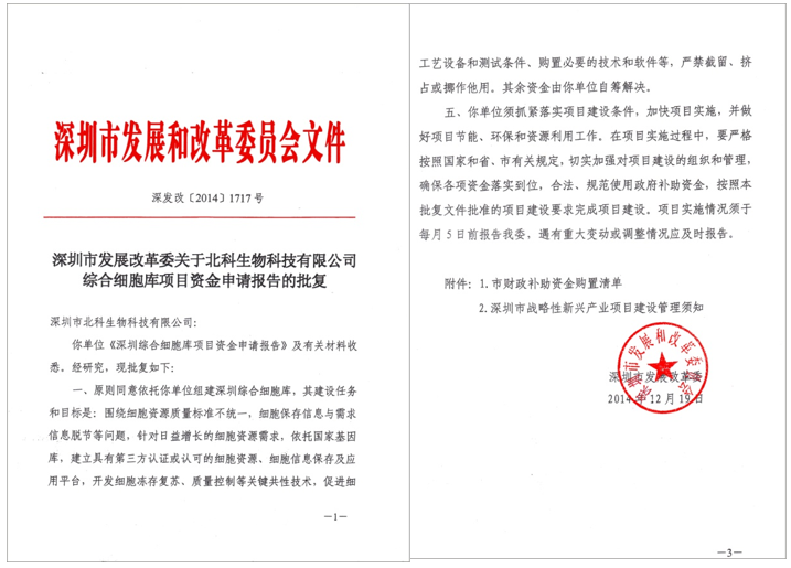 2014年12月,深圳市發改委發布《深圳市發展改革委關(guan) 於(yu) 北科生物科技有限公司綜合細胞庫項目資金申請報告的批複》 (深發改〔2014〕1717號)