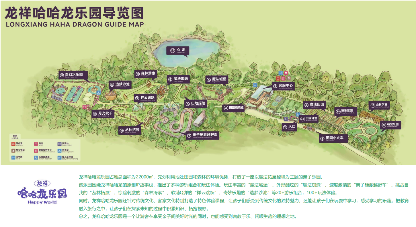 龍祥哈哈龍樂(le) 園是由華僑(qiao) 城(廣東(dong) )城市更新投資有限公司與(yu) 龍祥康體(ti) 共同打造,位於(yu) 深圳甘坑都市田園的魔法森林主題戶外山林親(qin) 子樂(le) 園。項目毗鄰深圳地鐵10號線甘坑站及深圳甘坑客家小鎮,交通便利,風景優(you) 美。樂(le) 園占地約20000㎡。親(qin) 子樂(le) 園由遊樂(le) 行業(ye) 知名企業(ye) 龍祥康體(ti) 精心打造。原創IP龍卡通為(wei) 主角,以奇幻魔法森林為(wei) 主題的特色親(qin) 子樂(le) 園。