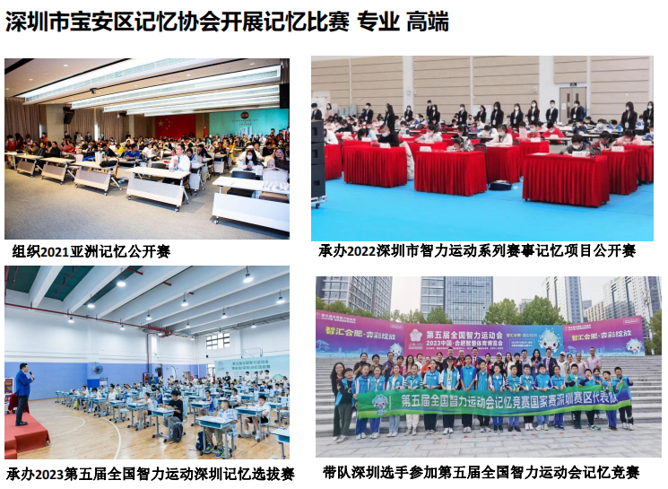 深圳市寶安區記憶協會(hui) 承辦了2022年深圳 市智力運動係列賽事之記憶項目公開賽等多個(ge) 記憶比賽,2023年主辦第五屆全國智力運動會(hui) 記 憶項目深圳選拔賽、協辦第五屆全國智力運動會(hui) 全國記憶競賽等。深圳市寶安區記憶協會(hui) 有能 力幫助各個(ge) 學校培養(yang) 記憶訓練師,輻射各個(ge) 學校的記憶訓練師能幫助無數學生學到科學的記憶 方法,提升學習(xi) 成績並考取名校,這是深圳市寶安區記憶協會(hui) 能為(wei) 社會(hui) 做出的最大貢獻。