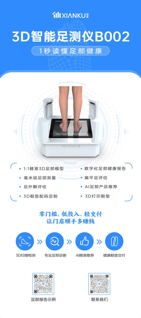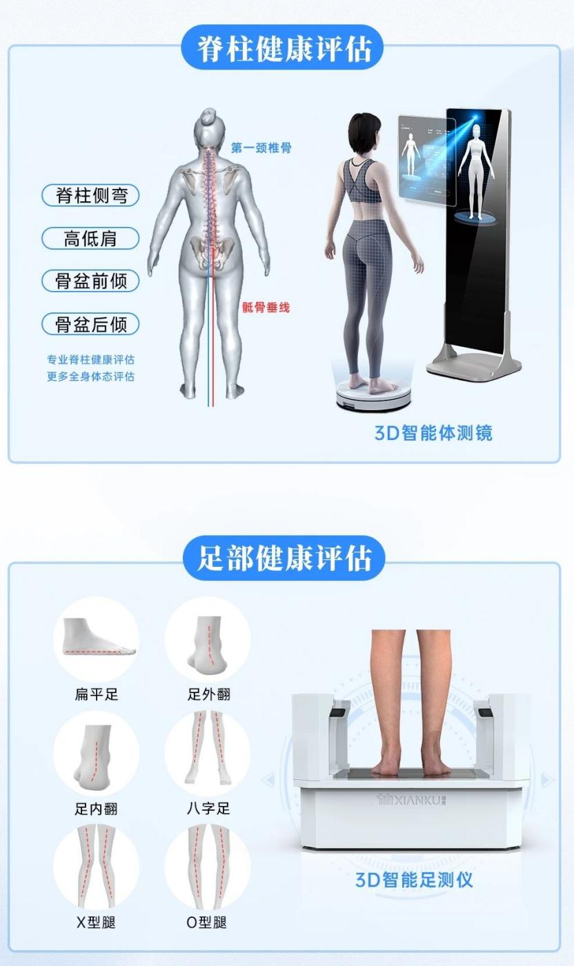 仙庫3D智能體(ti) 測鏡依托3D結構光技術,可在20秒內(nei) 完成人體(ti) 全身720°掃描,1分鍾內(nei) 即可構建1:1真實3D人體(ti) 模型,實現毫米級精度的3D人體(ti) 體(ti) 征數據的高效采集,涵蓋人體(ti) 圍度、身體(ti) 成分、體(ti) 態健康、胸型診斷、足部健康等超過128項的人體(ti) 全身體(ti) 征信息。仙庫3D智能足測儀(yi) 利用紅外結構光模組和固定式三維剛體(ti) 重建技術,建立真實1:1的足部3D模型,快速掃描,20秒獲得足部測量、足弓分析、拇外翻分析、足外翻分析、肥瘦度分析數據。仙庫的3D智能體(ti) 測設備可以實現科學、高效的足脊健康檢測,生成針對性的足脊健康方案,匹配專(zhuan) 屬定製的3D足脊健康產(chan) 品來矯正改善體(ti) 態。