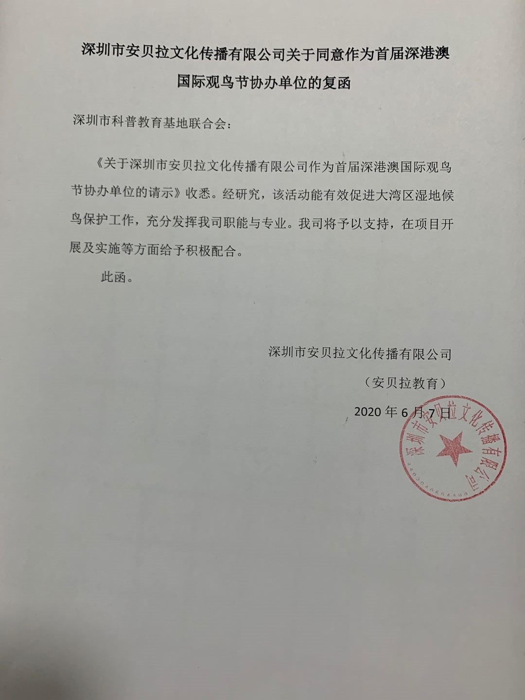 深圳市安貝拉教育複函