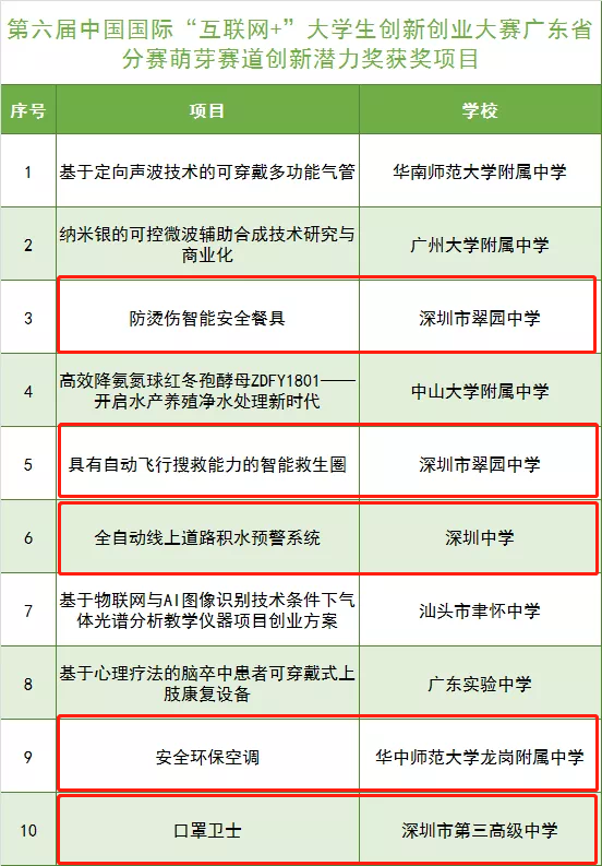 8月12日,第六屆中國國際“互聯網+”大學生創新創業(ye) 大賽廣東(dong) 省分賽萌芽賽道項目(以下簡稱省分賽萌芽賽道)評審工作結束,10個(ge) 項目從(cong) 中脫穎而出,榮獲省分賽萌芽賽道“創新潛力獎”,將代表廣東(dong) 省參加全國總決(jue) 賽的角逐。其中,5個(ge) 項目來自深圳學校,分別是深圳市翠園中學、深圳中學、華中師範大學龍崗附屬中學和深圳市第三高級中學。深圳市翠園中學有兩(liang) 個(ge) 項目獲獎。
