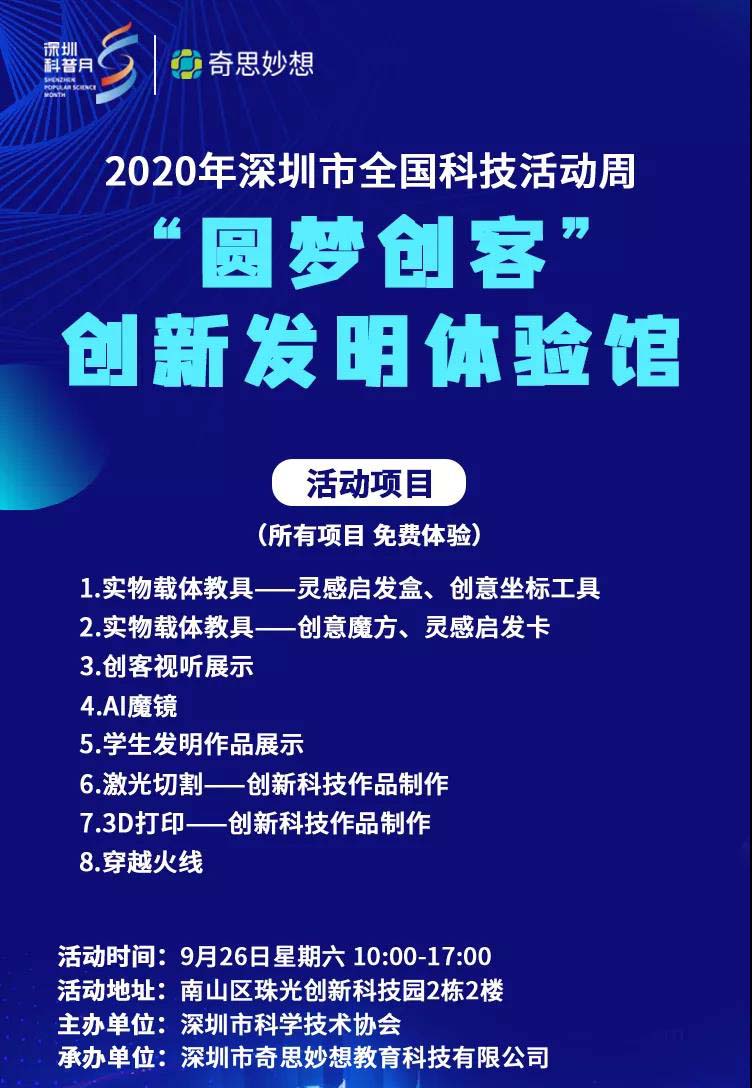 為(wei) 響應國家“創新教育”的號召,進一步提高中小學生科學素養(yang) ,培養(yang) 學生創新精神,9月26日 10:00-17:00,由深圳市科學技術協會(hui) 主辦、深圳市奇思妙想教育科技有限公司承辦的2020年深圳市全國科技活動周——“圓夢創客”創新發明體(ti) 驗館活動(以下簡稱“圓夢創客”活動)將在珠光創新科技園2棟2樓舉(ju) 行。