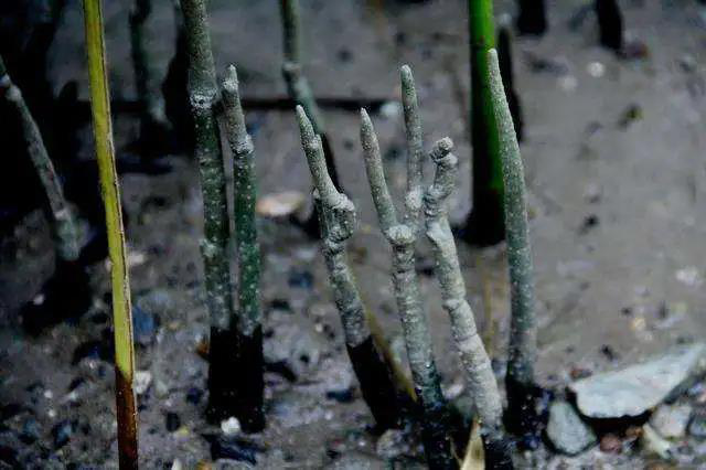 “挺身而出”,從樹幹基部長出,牢牢抓住地麵,形成了穩固的支架,使得紅樹林在風浪摧殘中依然屹立不倒。