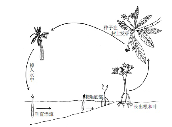 由於生長在浪潮之間,如果紅樹種子成熟後馬上脫落入海,就會被洶湧的海浪卷走,從而失去生長繁殖的機會,於是,就像哺乳動物懷胎生娃一樣,紅樹林的