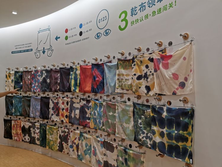 大家跟隨者科普導師的腳步,觀看了導演區會(hui) 變色的“感溫油墨”;親(qin) 手觸摸了棉花、羊毛和蠶絲(si) ;看導師示範操作紡織機;進行觸摸布料小遊戲;參觀布料抵抗力實驗測試;親(qin) 自體(ti) 驗滴染,製作專(zhuan) 屬花紋染布;和布偶互動;學習(xi) 紮小布揪。