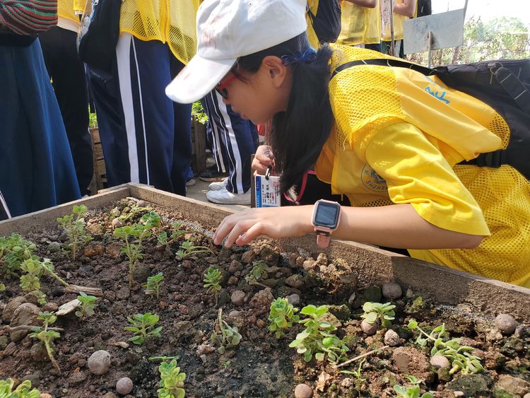 同學們(men) 還近距離接觸香草植物,用手觸摸香草植物,細嗅指尖沾染的芳香,摘下一片品嚐味道。