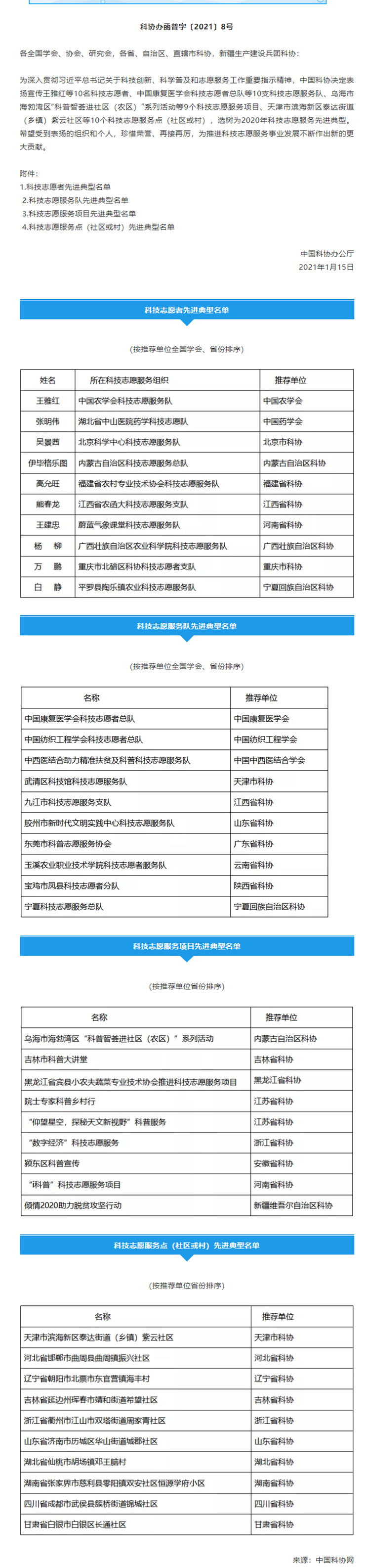 中國科協辦公廳關於公布2020年度科技誌願服務先進典型的通知