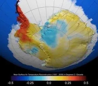 通過長期的數據監測,科學家繪製了這張整個(ge) 南極的氣溫變化圖。圖中可以看出,南極的大部分地區氣溫都沒有明顯的變化,上升幅度都小於(yu) 0.25℃。而紅色部分的南極半島區域,表麵溫度比1957年上升了3.5℃。這個(ge) 數據變化非常明顯。