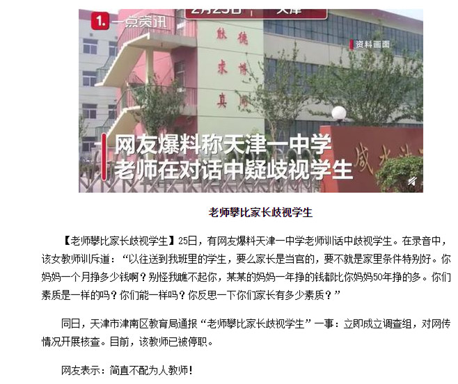 天津一老師攀比家長歧視學生,通報來了