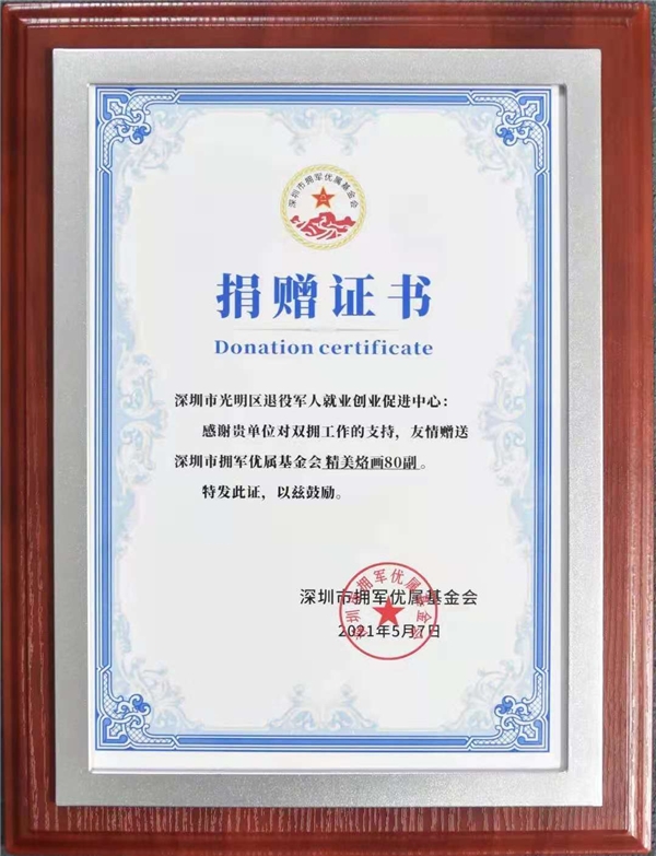 深圳市委原常委、深圳警備區原司令員、深圳市擁軍優屬基金會董事長劉勇在聽取張守福關於基地和中心擁軍優屬工作情況的匯報後,對光明烙畫基地和促進中心為建設深圳雙擁模範城做出的貢獻給予充分肯定。烙畫基地和促進中心開展的一係列雙擁工作積極推動軍民融合,促進了軍民團結,尤其是創新雙擁模式打造“藝術雙擁基地”為軍人及其家屬送去精神文化食糧,豐富軍人的文化生活,在轄區營造出了良好的擁軍優屬氛圍。劉勇現場還為光明區退役軍人促進中心和弘揚烙畫公司頒發了捐贈證書。