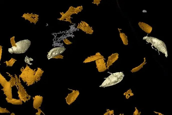Qvarnström和同事們(men) 在奧濟梅克(波蘭(lan) 西南的城鎮)附近的一個(ge) 黏土坑中發現了一枚一角硬幣大小的糞化石。科學家們(men) 對西裏龍所處的三疊紀食物網很感興(xing) 趣,所以他們(men) 用同步輻射微斷層掃描成像技術(synchrotron microtomography)記錄了這塊不透明化石的內(nei) 部組成。其中,X射線從(cong) 各個(ge) 方向射入化石,清晰地呈現了其內(nei) 部組成情況。將生成的圖像文件以數字化方式拚接到糞化石內(nei) 部的3D模型中是一項很費力的工作,但當那些甲蟲的細節最終呈現在Qvarnström麵前的時候,他驚呆了:“它們(men) 就好像在你麵前活了過來了一樣。”