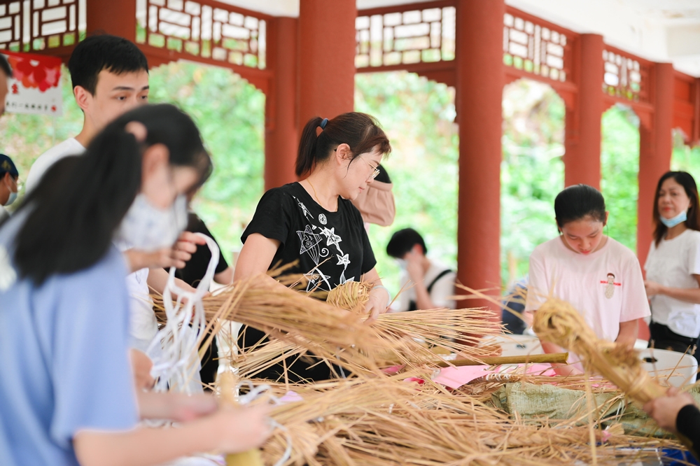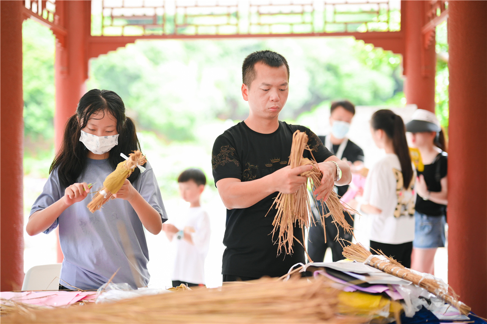 在“創意手工區”“互動體驗區”,小朋友們和父母正親密合作,以“稻”元素開展創作,共同編製心目中的稻草人或稻草標本等,並在以農耕為主題的打卡牆拍照,現場充滿歡聲笑語。