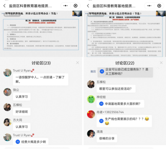 直播中孫老師強調科普基地的最新定義(yi) ,不僅(jin) 是教育基地,而是一個(ge) 更廣的範疇。孫老師根據《深圳市科普基地、科普示範點管理辦法》指出:申請市級科普基地必須的場地麵積、場館不少於(yu) 3名專(zhuan) 職人員、優(you) 質展教設備、固定的科普經費,擁有互動性強的科普內(nei) 容更容易申請獲得科普基地,另外,場館接待能力也是考核的重點,孫老師還解答了科普基地申請政府經費補貼的相關(guan) 事宜。深圳市科普基地125家,鹽田區有3家科普基地,科普內(nei) 容品質優(you) 良,鹽田區科普事業(ye) 潛力無限,誠摯邀請更多科技企業(ye) 加入科普行列。