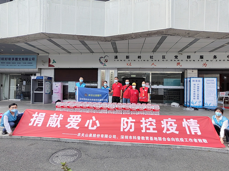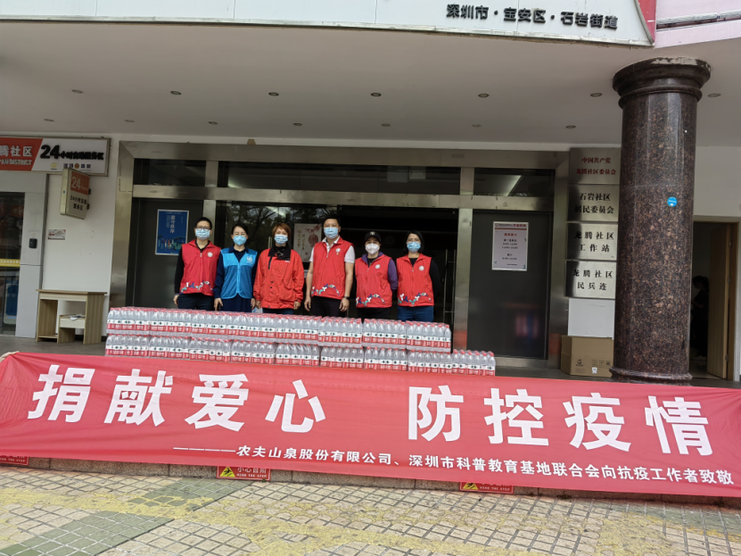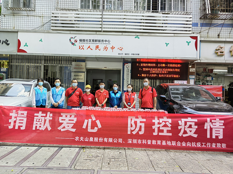 為(wei) 助力疫區疫情防控工作的順利展開,讓奮戰在一線的防疫人員有更好的防疫保障。3月13日,深圳市科普教育基地聯合會(hui) 聯合農(nong) 夫山泉股份有限公司共同向福田區華強北街道通新嶺社區、福強社區和寶安區石岩街道龍騰社區分別捐贈100件農(nong) 夫山泉水,借此表達攜手深圳人民共克時艱的信念和決(jue) 心。