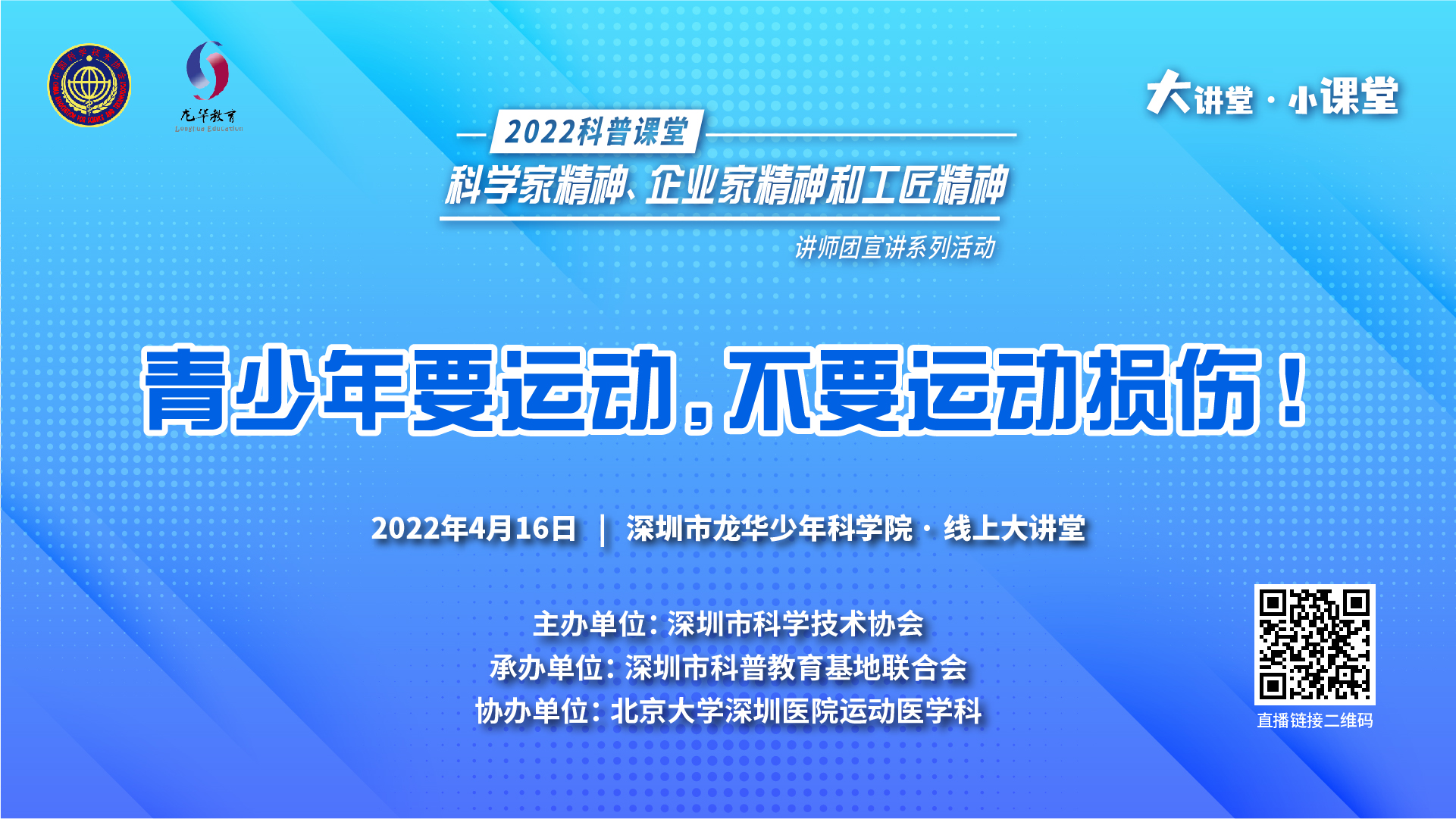 4月16日,由深圳市科學技術協會(hui) 主辦、深圳市科普教育基地聯合會(hui) 承辦、龍華區教育局和龍華區科技創新局協辦的2022年龍華“定製”科普講堂——科學家精神、企業(ye) 家精神和工匠精神講師團基層宣講活動“雲(yun) 上科普行”第九講走進深圳市龍華少年科學院·線上大講堂,給同學們(men) 帶來了一場青少年運動損傷(shang) 科普星空体育官网入口网站講堂。深圳科普平台對活動進行了全程直播,線上叁佰餘(yu) 名大小朋友觀看並參與(yu) 了直播互動。
