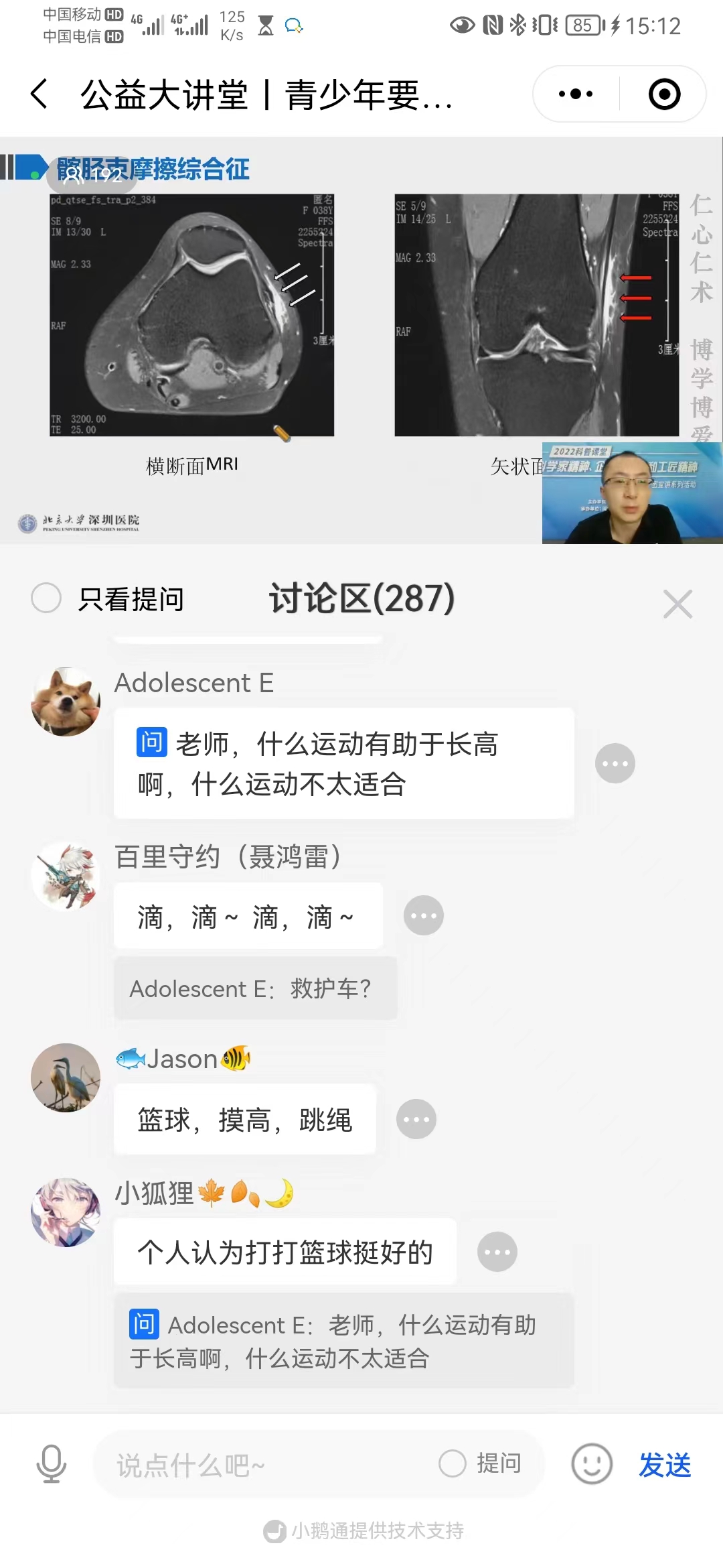 本次活動特邀北京大學深圳醫院運動醫學科副主任醫師、青少年運動損傷(shang) 租組長尤田博士擔任主講,主題為(wei) “青少年要運動,不要運動損傷(shang) !”,來自龍華區少年科學院、深圳市格致中學、龍華區外國語學校、龍華高級中學教育集團觀瀾校區、龍華區振能學校等學校學生參與(yu) 了直播講座。
