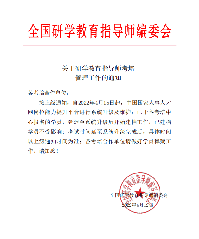 接全國研學教育指導師編委會(hui) 通知,因中國國家人才人事網崗位能力提升平台係統升級及維護,已報名培訓的學員,延遲至係統升級後開始建檔工作,已建檔學員不受影響。考試時間延至係統升級完成後,具體(ti) 時間以上級通知為(wei) 準。