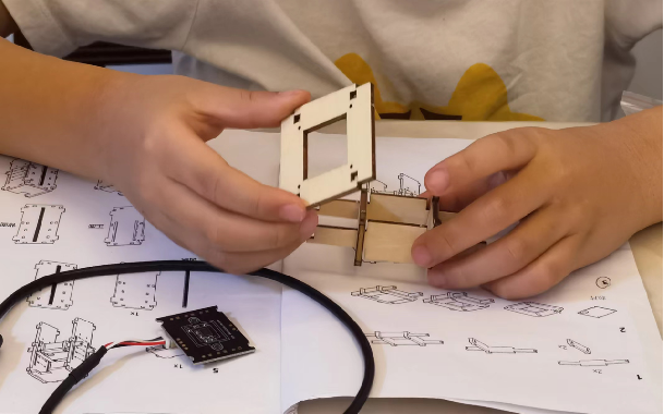 本產(chan) 品是借助激光切割技術,主框架的拚裝板件是刻在一塊木板上,方便取下,按照圖紙拚接起來成為(wei) 顯微鏡框架。整體(ti) 框架設計既要兼顧拚搭的可操作性,也要兼顧拚搭後放大光路的形成,傳(chuan) 動機械可實現微調等,主框架的設計改良十數版本。