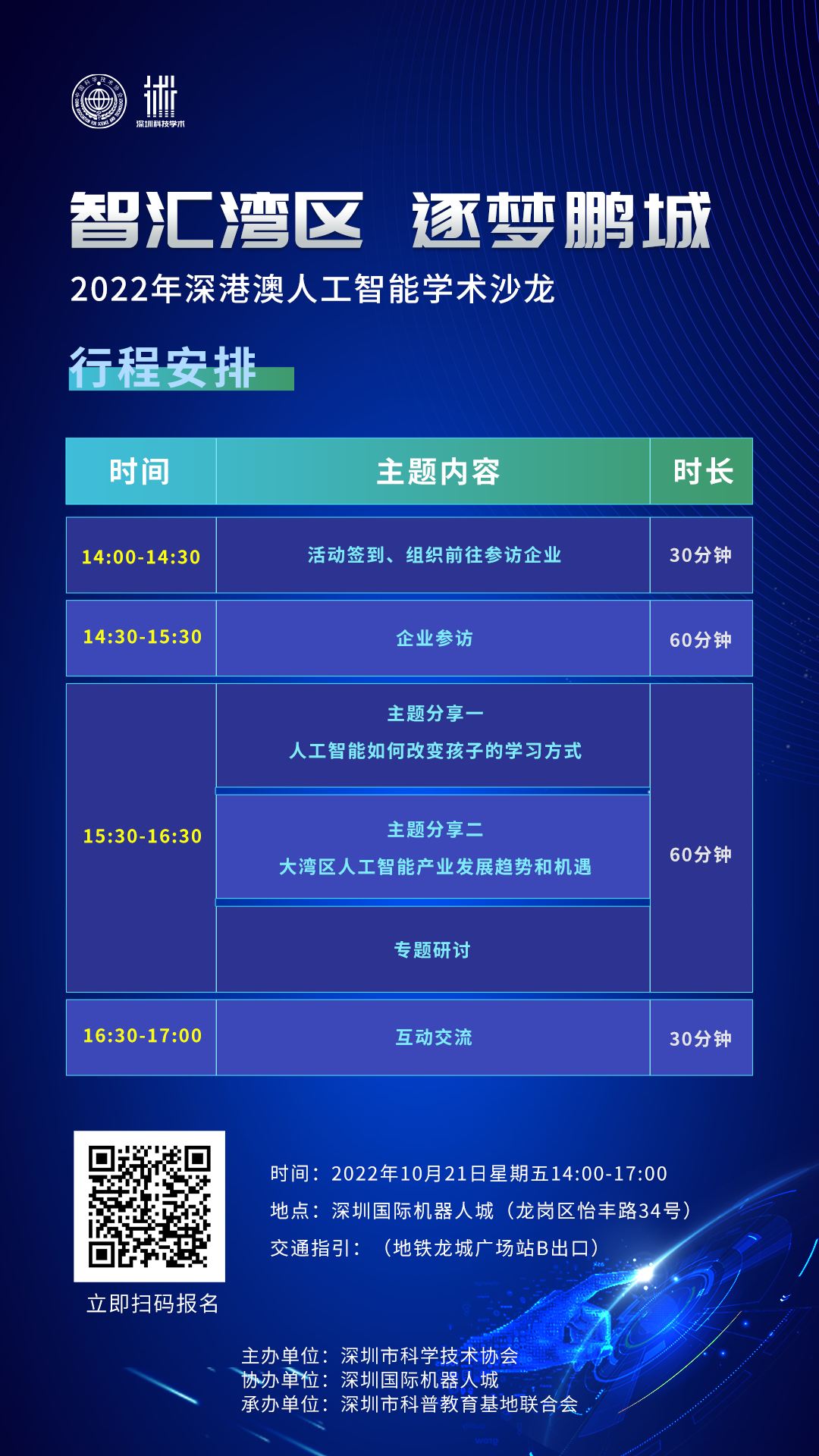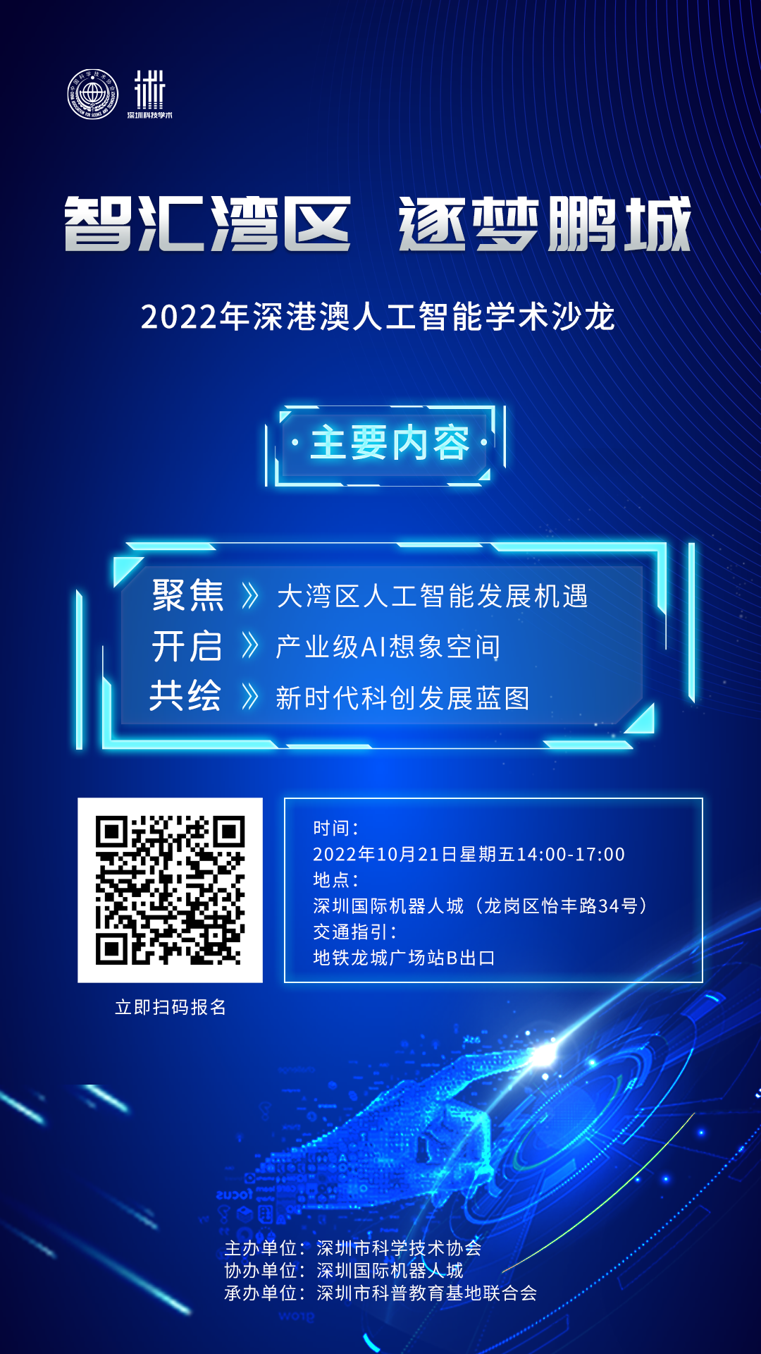 本次學術沙龍擬邀請深港澳三地科技工作者,以企業(ye) 參訪、專(zhuan) 題研討、互動交流相結合、線上同步雲(yun) 直播的形式展開。聚焦人工智能領域,共同探討大灣區人工智能產(chan) 業(ye) 發展趨勢和機遇。旨在為(wei) 三地優(you) 秀人才搭建交流平台,從(cong) 學術和產(chan) 業(ye) 界的角度探討信人工智能的學術研究進展以及產(chan) 業(ye) 應用現狀,促進三地創新要素開放共享,為(wei) 深港澳科技產(chan) 業(ye) 的創新合作與(yu) 發展,注入新活力、帶來新思路、激發新動力,促進大灣區人工智能產(chan) 業(ye) 的進一步落地與(yu) 發展,開啟大交往、大合作局麵。
