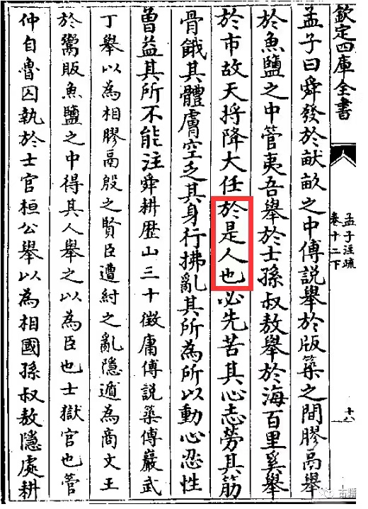 另外,人教社曆史上的這篇課文自1961年開始,包括1982年、1994年、2006年等各版本均是“天將降大任於(yu) 是人也”;四庫全書(shu) 刻本《孟子集注》(宋·朱熹 注),明代刻本《孟子注疏解經》(漢·趙歧 注)均為(wei) “是人”。