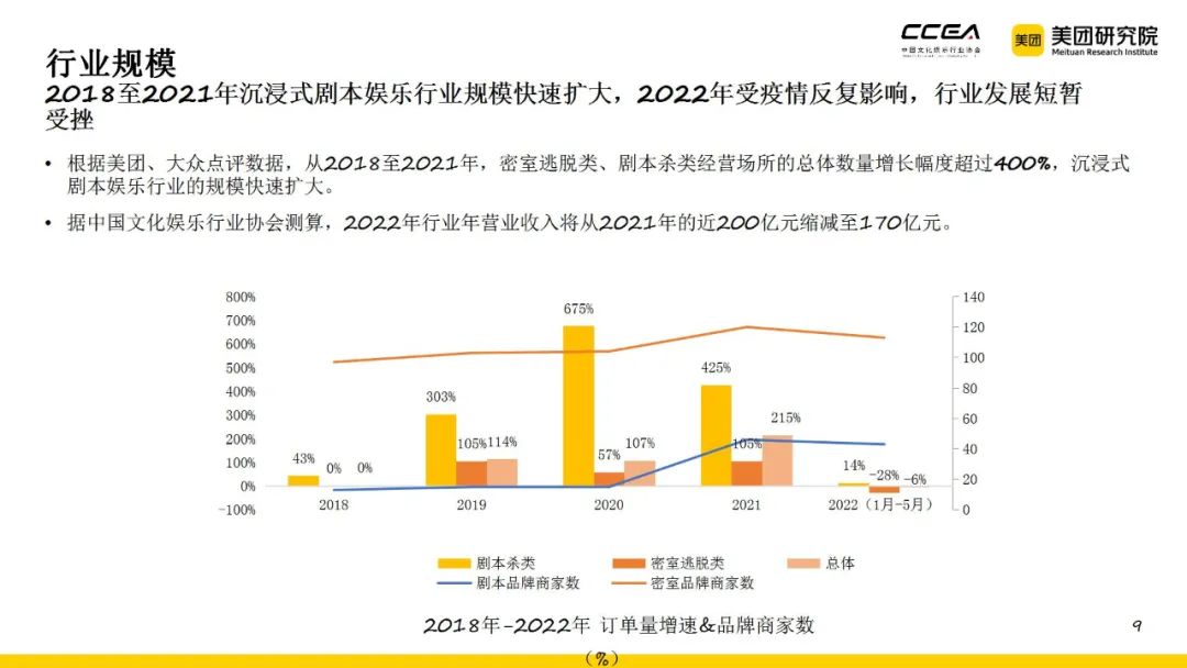 《報告》數據顯示,從(cong) 2018至2021年,密室逃脫類、劇本殺類經營場所的總體(ti) 數量增長幅度超過400%,沉浸式劇本娛樂(le) 行業(ye) 的規模快速擴大。2022年受疫情反複影響,行業(ye) 發展略顯受挫,據中國文化娛樂(le) 行業(ye) 協會(hui) 測算,2022年行業(ye) 年營業(ye) 收入將從(cong) 2021年的近200億(yi) 元縮減至170億(yi) 元。