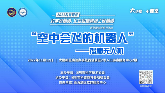 11月12日上午,由深圳市科學技術協會(hui) 主辦、深圳市科普教育基地聯合會(hui) 承辦的“2022科普課堂”——科學家精神、企業(ye) 家精神和工匠精神講師團基層宣講活動《空中會(hui) 飛的機器人-揭秘無人機》主題科普講座在大鵬新區西湧社區黨(dang) 群服務中心成功舉(ju) 辦。本次講座邀請到了全球鷹(深圳)無人機有限公司總經理、深圳無人機行業(ye) 協會(hui) 副會(hui) 長餘(yu) 景兵作為(wei) 主講老師。西湧景區黨(dang) 群服務中心負責人梁景連出席講座。同時,社區青少年、居民、社工近50人參加了此次講座。