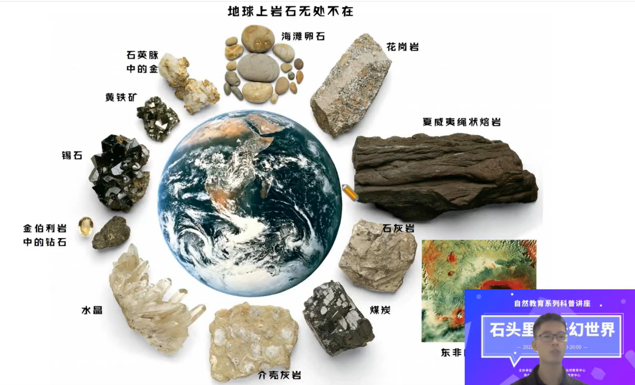 在地質主題科普講座,從(cong) 岩石的與(yu) 人類的關(guan) 係入手,帶大家學習(xi) 了三大岩石的轉變機製以及如何辨認三類岩石。崔博士還給觀眾(zhong) 逐一講解了地球演變地質板塊、氣候演變的曆史、生命由低級到高級演變的曆程。同時給大家科普了一個(ge) 多數人沒接觸過的概念——礦物的進化史。我們(men) 知道植物和動物都是進化而來,礦物這種沒有生物的無機物也會(hui) 進化,真是聞所未聞。