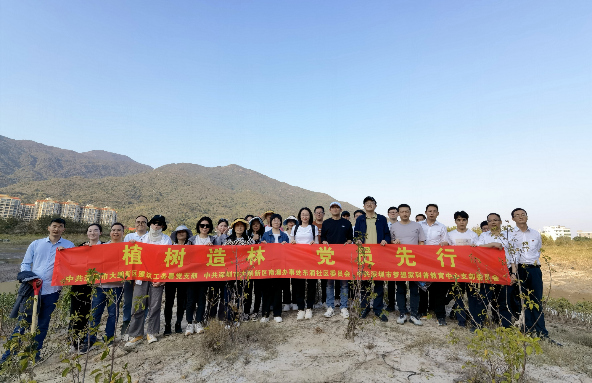 習(xi) 近平總書(shu) 記強調:綠水青山就是金山銀山。為(wei) 深入踐行創新、協調、綠色、開放、共享的發展理念,推進新時代中國特色社會(hui) 主義(yi) 先行示範區生態文明建設,構築本固基強的黨(dang) 支部戰鬥堡壘,構建“天藍地綠水清”的大鵬生態屏障,結合“不忘初心、牢記使命”主題教育,2023年3月10日,中共深圳市夢想家科普教育中心支部聯合大鵬新區建築工務署黨(dang) 支部、大鵬新區南澳辦事處東(dong) 湧社區黨(dang) 委共計40餘(yu) 位黨(dang) 員,共同開展“植樹造林 黨(dang) 員先行”主題黨(dang) 日活動。