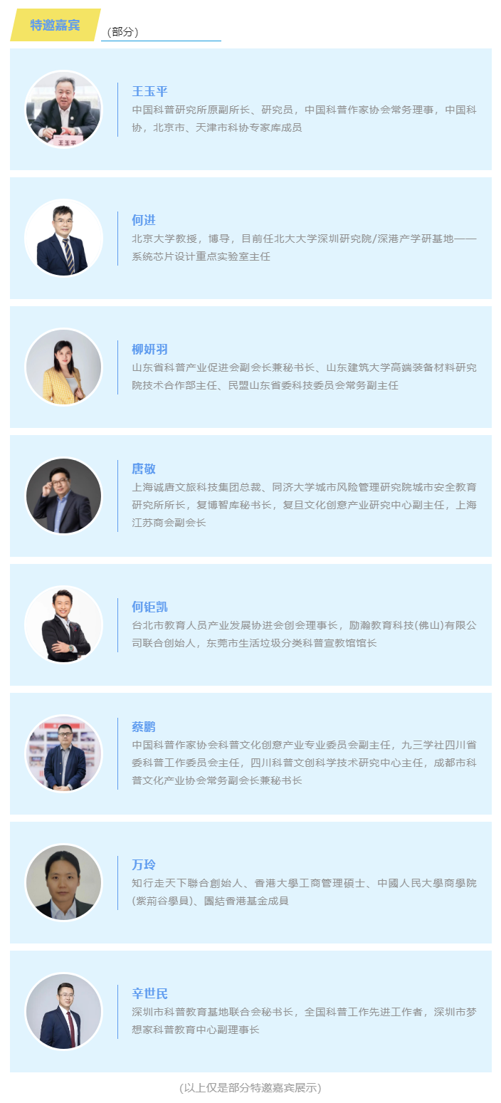 9:00~9:55 領導致辭、書(shu) 籍揭牌發行、工作匯報 9:55~10:05 科普先進單位等頒獎授牌 10:05~10:45 《數字化賦能科普工作》 10:45~11:05 《運用數字化方式推進數字科普工作》-中國科學館 11:05-11:35 合影留念 14:00~14:10 深圳市科協領導致辭 14:10~14:20 深圳市奇點科普產(chan) 業(ye) 發展研究院揭牌儀(yi) 式 14:20~14:35 中國科普聯盟成立儀(yi) 式 14:35~14:50 中國科普聯盟成員簽訂合作框架協議 14:50~15:10 王玉平 中國科普研究所原副所長 議程:強國建設科普產(chan) 業(ye) 發展新使命 15:10~15:30 何進 北京大學教授 議程:匯聚社會(hui) 各階層力量共建科普事業(ye) 共同體(ti) 15:30~15:50 柳妍羽 山東(dong) 省科普產(chan) 業(ye) 促進會(hui) 秘書(shu) 長 議程:深化“兩(liang) 翼理論”,促進科普科創協同發展 15:50~16:10 唐敬 上海誠唐文旅科技集團總裁 議程:人工智能技術如何賦能科普產(chan) 業(ye) 16:10~16:30 何钜凱 台灣科普教育協會(hui) 議程:台灣科普教育先行者