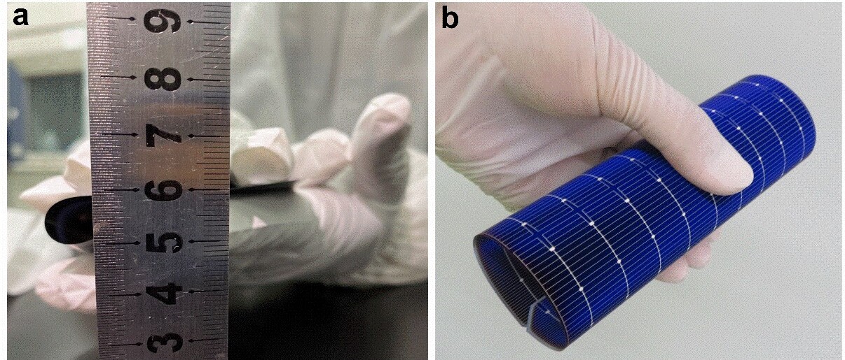 圖1. a, 柔性太陽電池矽片彎曲半徑小於(yu) 5毫米;b,柔性太陽電視彎曲角度超過360度。