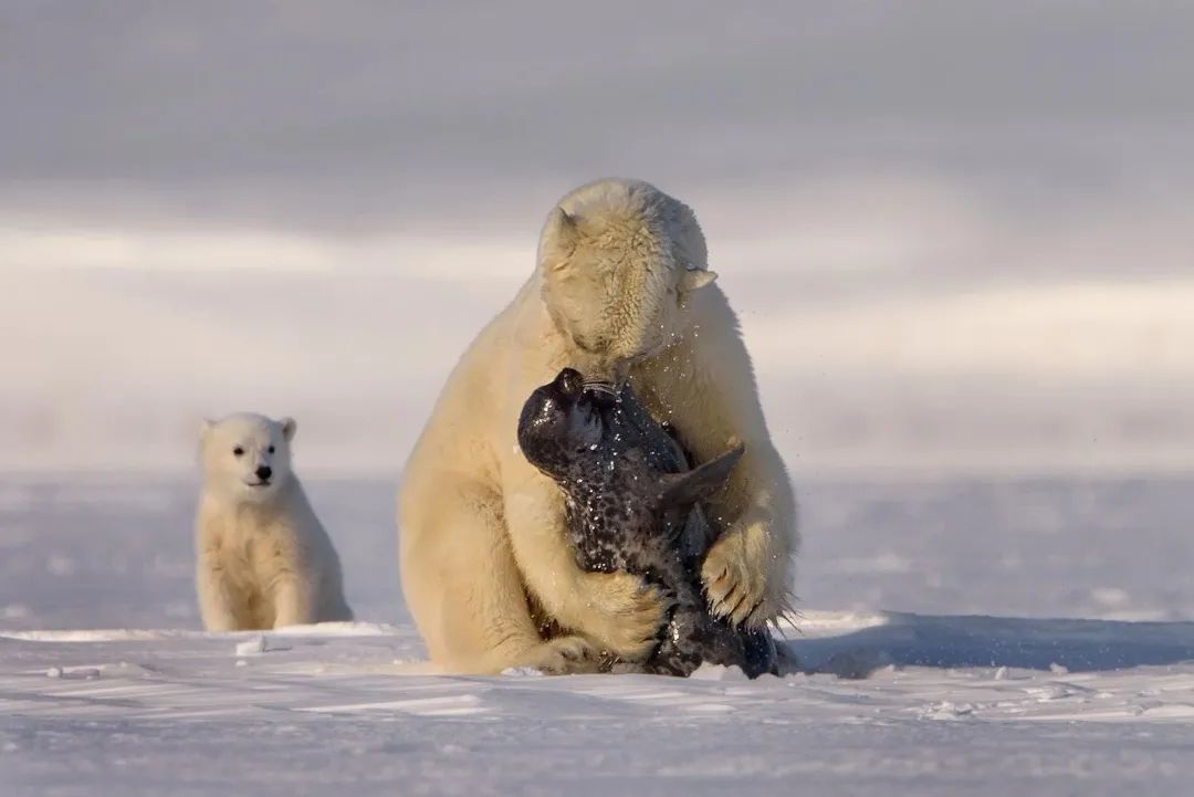 而進入冬季後,隨著光照時間變短,海豹沒啥興(xing) 趣在海冰上活動,北極熊的捕獵機會(hui) 減少,不過它們(men) 很清楚獵物的習(xi) 性,雖然海豹可以在水下潛泳,但是過幾個(ge) 小時也得浮出水麵進行呼吸,因此北極熊會(hui) 靜靜地蹲守在海冰上的洞口旁,當海豹在洞口露頭時,北極熊會(hui) 迅速出爪,猛擊海豹頭部,同時衝(chong) 上去咬住海豹的身體(ti) ,將其拖到冰麵上的安全位置進行享用。