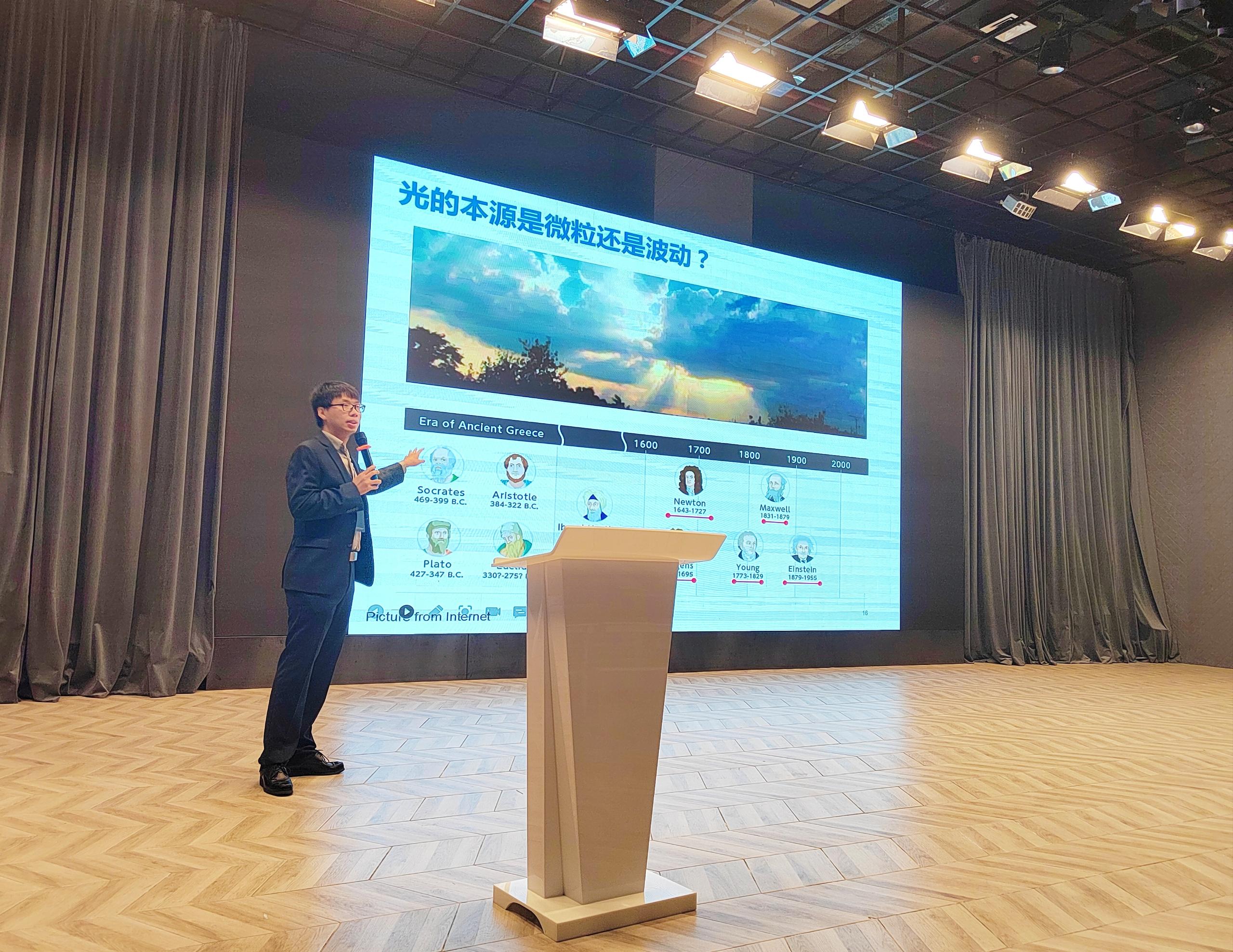 在講座中,魯大為(wei) 教授首先從(cong) 光的本源之爭(zheng) 談起,引導大家理解光的波粒二象性。他詳細介紹了牛頓的微粒說、惠更斯的波動說,以及愛因斯坦的光子說,闡述了這些理論的發展和演化。他深入淺出地解釋了光的粒子性和波動性,以及它們(men) 如何相互作用,這對於(yu) 理解量子力學的基礎概念至關(guan) 重要。這一階段的講解讓同學們(men) 對光的本源有了更深入的理解。