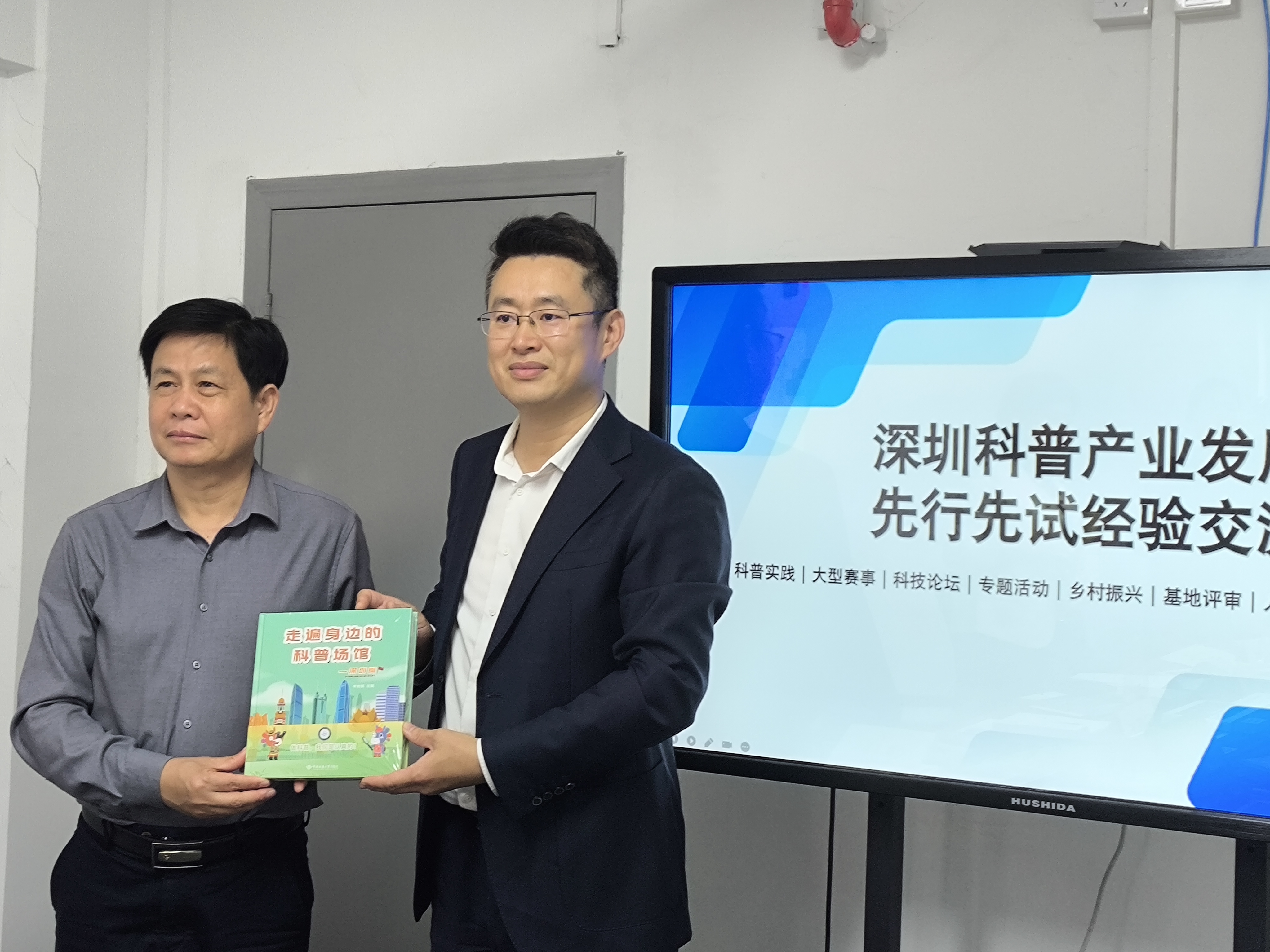 深圳市科普教育基地聯合會(hui) 邀請廣西氣象學會(hui) 來到五樓會(hui) 議室分享深圳科普產(chan) 業(ye) 發展的經驗交流環節。雙方就科普產(chan) 業(ye) 的創新發展、資源整合及未來趨勢等議題進行了深入的探討與(yu) 交流,共同分享了深圳在科普產(chan) 業(ye) 發展方麵的先行先試經驗。