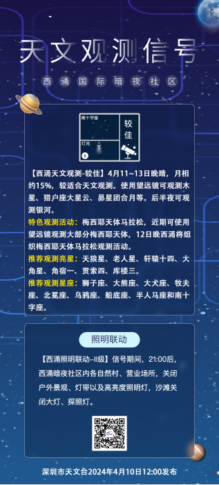 4月10日,深圳市天文台發布了西湧天文觀測信號,根據信號指引,12日晚,深圳市天文台和西湧國際暗夜社區組織的2024年梅西耶天體(ti) 馬拉鬆觀測活動將同時開啟線上線下直播。