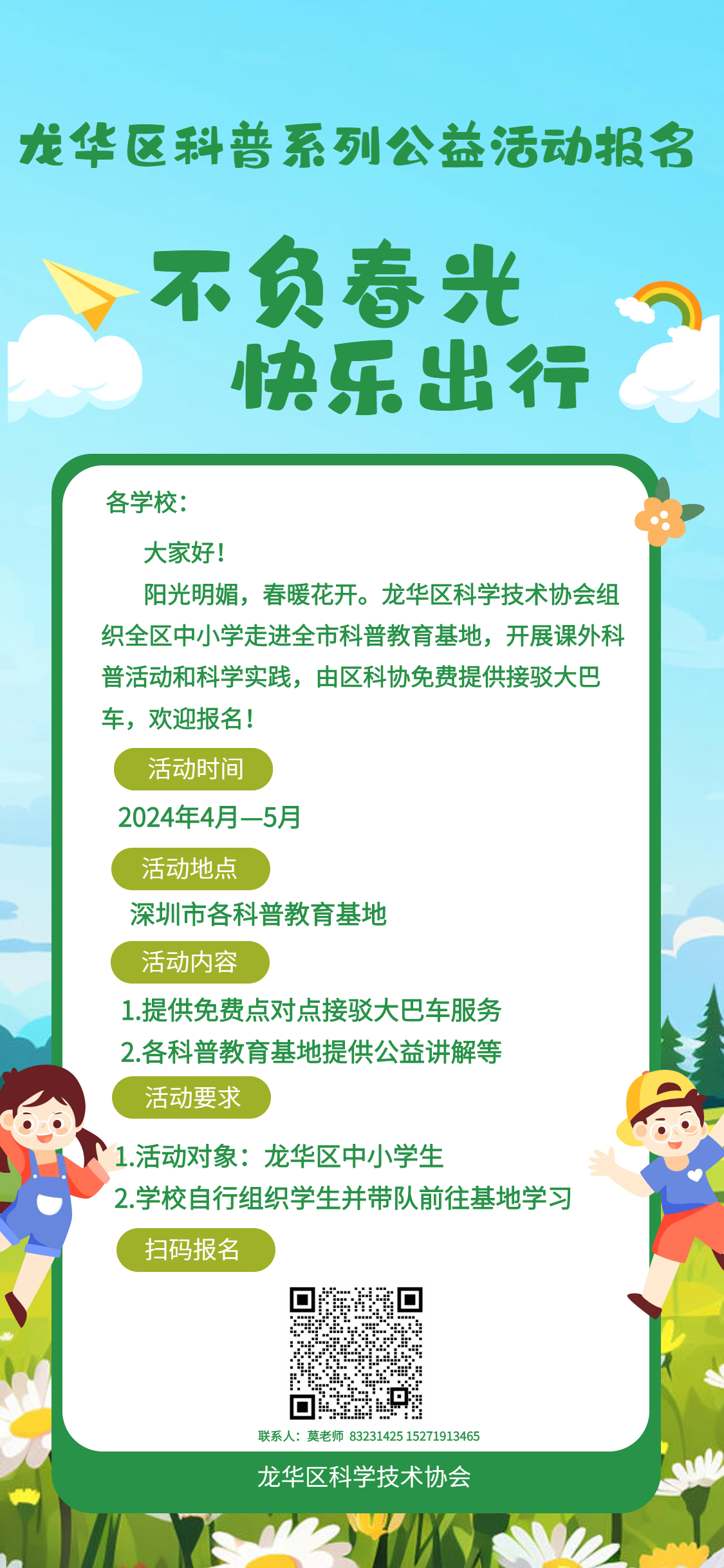 據悉,龍華區科普係列活動—科普進基地將會(hui) 有龍華區50所中小學校走進深圳市各個(ge) 科普基地開展課外學習(xi) 與(yu) 科學實踐。深圳市科普教育基地聯合會(hui) 通過提供免費大巴服務解決(jue) 師生出行問題,並安排專(zhuan) 人負責科普基地預約、車輛和日程安排,確保參觀安全暢行。