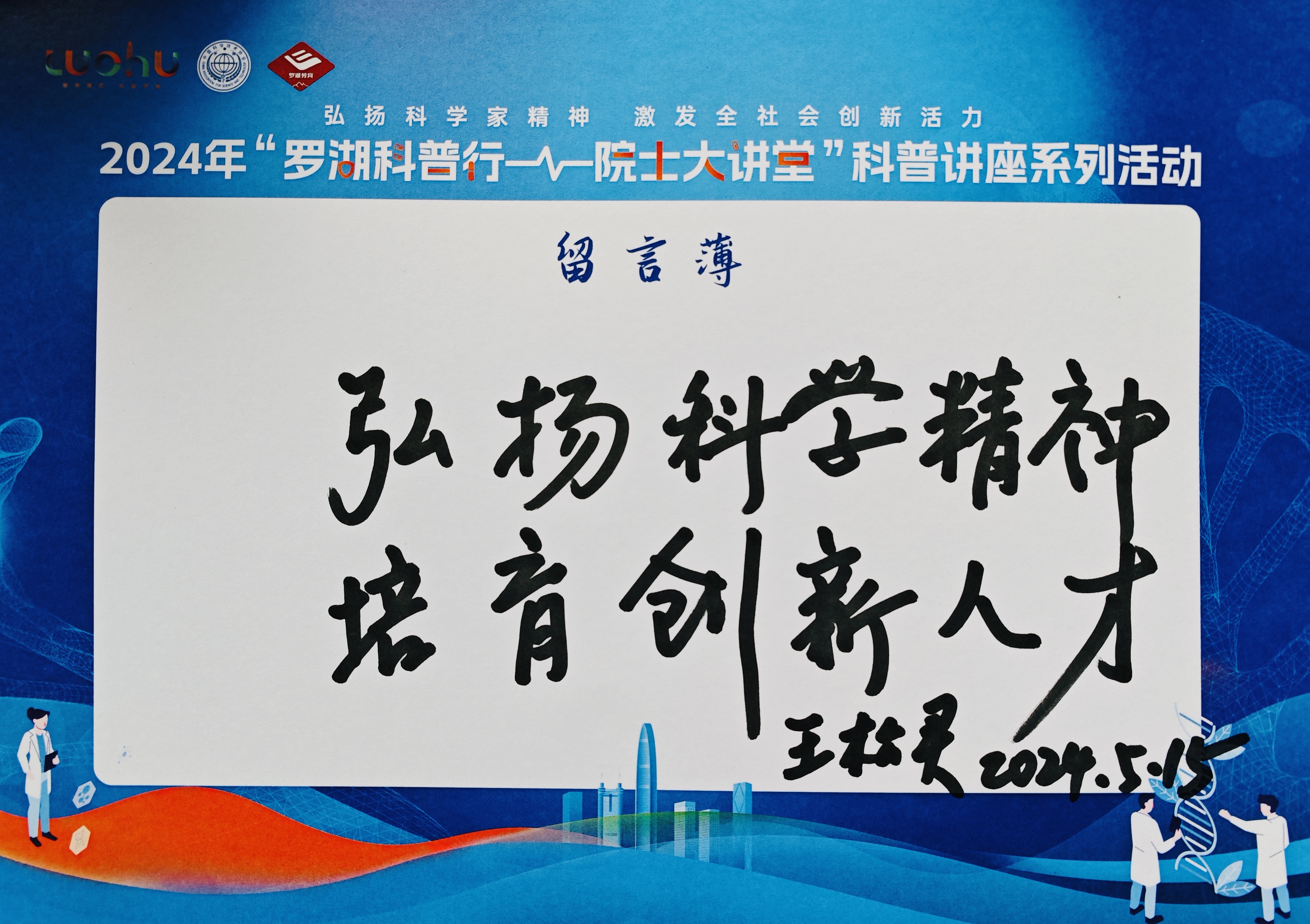 交流環節結束後,羅湖高級中學的學生代表向院士贈送科創作品,活動主辦方向院士贈送活動紀念牌。同時,王院士給同學們(men) 寫(xie) 下殷切寄語“弘揚科學精神,培育創新人才”,希望同學們(men) 積極傳(chuan) 播科學星空体育官网入口网站和科學精神,進一步培養(yang) 自己的科學思維和科學方法,學會(hui) 用科學的態度去看待世界,用科學的方法去解決(jue) 問題,激發更多的創新熱情和創造活力,為(wei) 推動社會(hui) 進步和發展貢獻自己的力量。