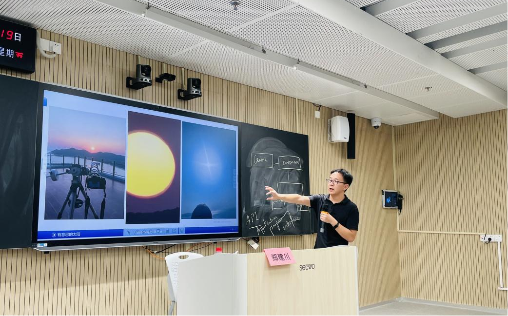 7月20日,活動邀請天文台專(zhuan) 家鄭建川博士到深圳市福田中學為(wei) 同學們(men) 開展《有意思的太陽》天文觀測主題科普講座,現場王浩博士、鄭建川博士與(yu) 參與(yu) 活動的師生們(men) 共同探討未來AI如何賦能天文觀測。