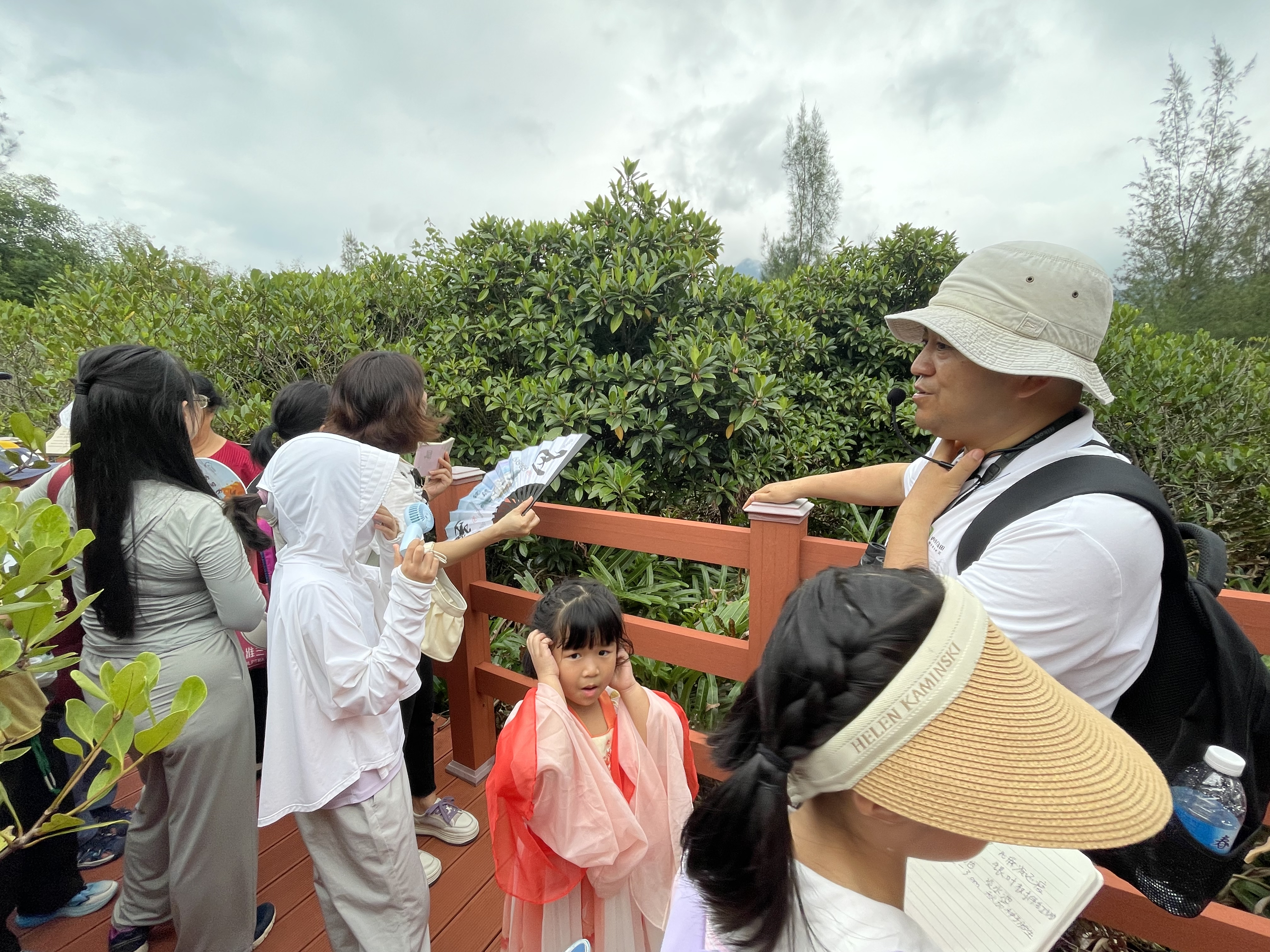 活動當天,特別邀請了廣東(dong) 內(nei) 伶仃福田國家級自然保護區正高級工程師徐華林老師,為(wei) 參與(yu) 的家庭帶來了一場生動有趣的“行走中的科普課堂”。徐老師不僅(jin) 帶領大家認識了紅樹的種類及其區分——真紅樹和半紅樹,還帶領大家認識了500餘(yu) 年樹齡的銀葉樹,開啟了一段尋找最古老銀葉樹的奇妙旅程。通過實地參觀紅樹林,參與(yu) 者得以近距離觀察銀葉樹,並探討了紅樹如何適應高鹽環境,例如鹽分排泄機製、獨特的根係結構等。這些內(nei) 容不僅(jin) 讓孩子們(men) 了解了紅樹為(wei) 何被稱為(wei) “紅樹海岸衛士”,也讓家長受益匪淺。