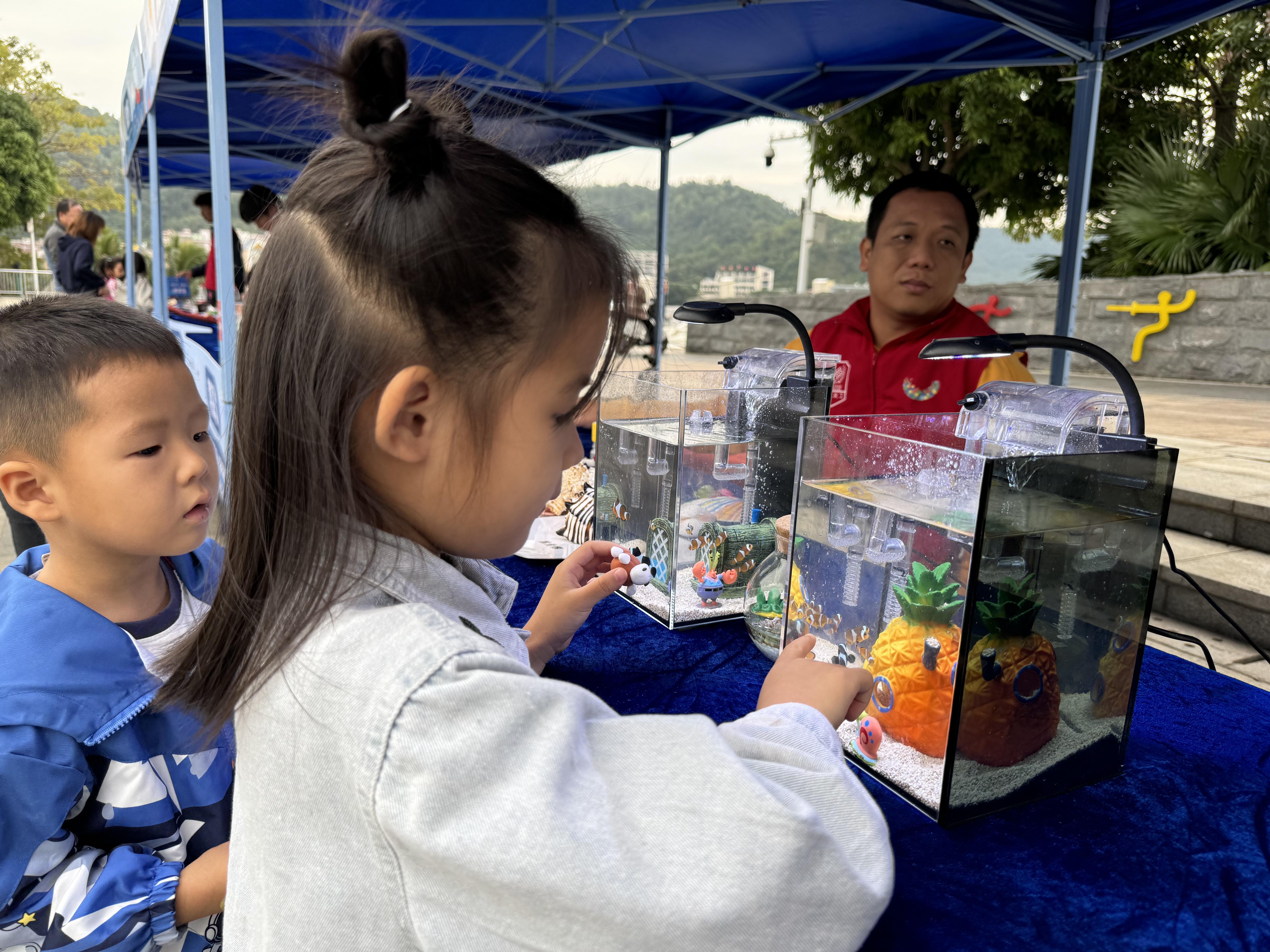 在海生物區,參與(yu) 者們(men) 近距離接觸了小醜(chou) 魚、彈塗魚、海星等海洋生物,聆聽專(zhuan) 業(ye) 講解員的介紹,深入了解這些生物的生活習(xi) 性及其生態價(jia) 值。