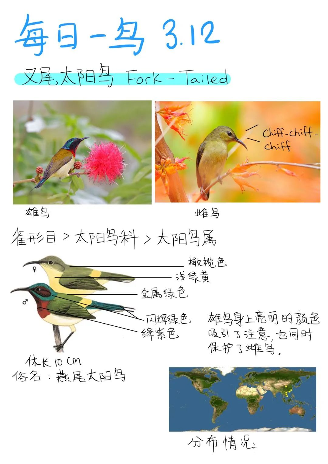 大家好!我是王雨迪,今天要科普的是叉尾太陽鳥。它們(men) 是深圳的留鳥,經常出沒在深圳灣公園。雄性太陽鳥和雌性太陽鳥有著完全不同的顏色。這種顏色的差別是雄鳥要保護雌鳥的體(ti) 現。這些好看的圖片都是舅舅不停的追蹤叉尾太陽鳥時拍下的。