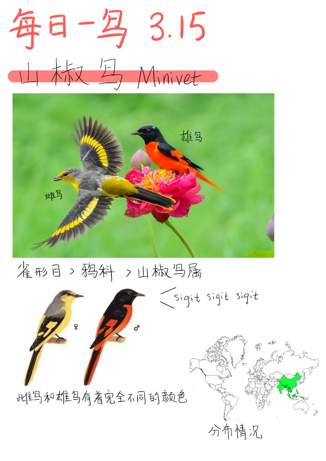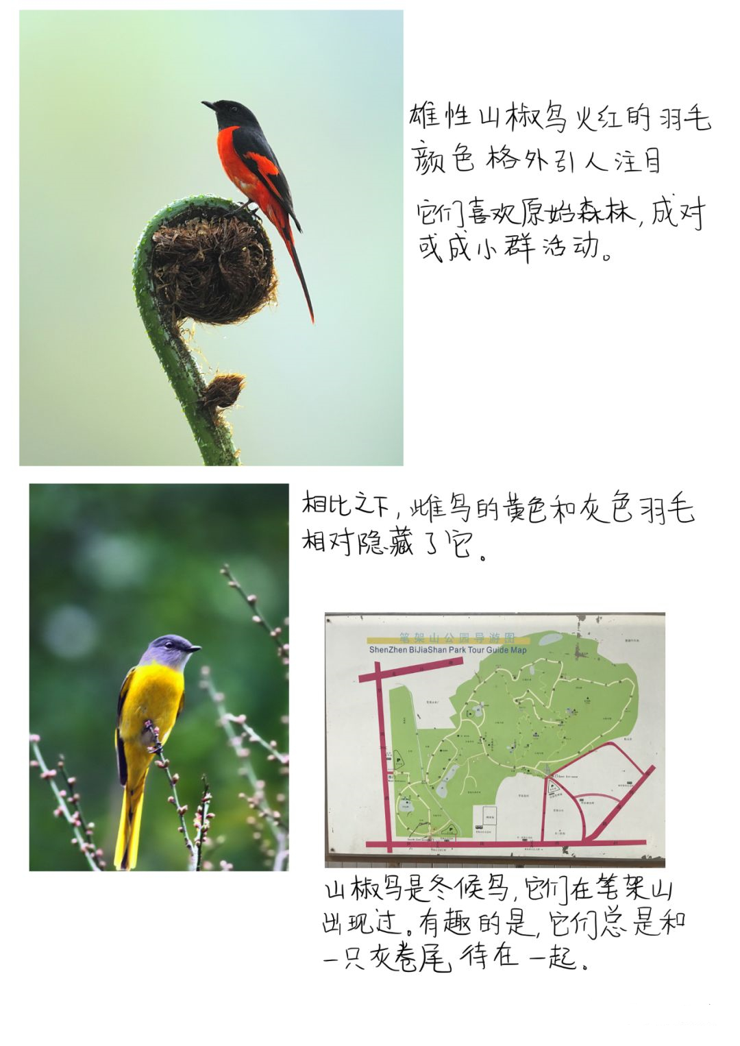 今天科普的是山椒鳥,雄鳥的鮮紅色羽毛讓它們(men) 格外引人注目,也和雌鳥灰黃色的羽毛形成了對比。它們(men) 喜歡吃蟲子,也吃植物種子。它們(men) 是冬候鳥,曾經出現在筆架山公園,並且一直和灰卷尾在一起。