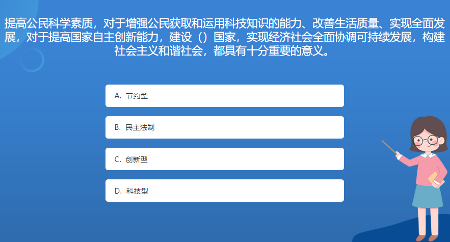 科普星空体育官网入口网站問答:提高公民科學素質,對於增強公民獲取和運用科技星空体育官网入口网站的能力、改善生活質量、實現全麵發展,對於提高國家自主創新能力,建設()國家,實現經濟社會全麵協調可持續發展,構建社會主義和諧社會,都具有十分重要的意義。