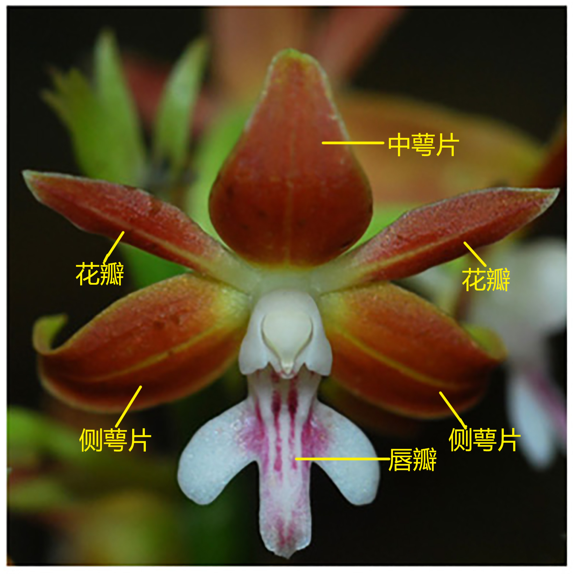 枚花被片稱為花瓣,其中有一枚花瓣明顯不同,形態結構上更為複雜、特殊。這枚花瓣就是蘭花在長期的進化中特化的唇瓣。唇瓣上色彩豐富的斑塊可以吸引傳粉昆蟲,特殊的構造可作為傳粉昆蟲進入花中進行傳粉的踏板,在蘭科植物的傳粉中扮演及其重要的角色。