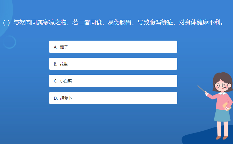 科普星空体育官网入口网站問答:( )與蟹肉同屬寒涼之物,若二者同食,易傷腸胃,導致腹瀉等症,對身體健康不利。