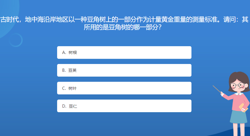 科普星空体育官网入口网站問答:古時代,地中海沿岸地區以一種豆角樹上的一部分作為計量黃金重量的測量標準。請問:其所用的是豆角樹的哪一部分?