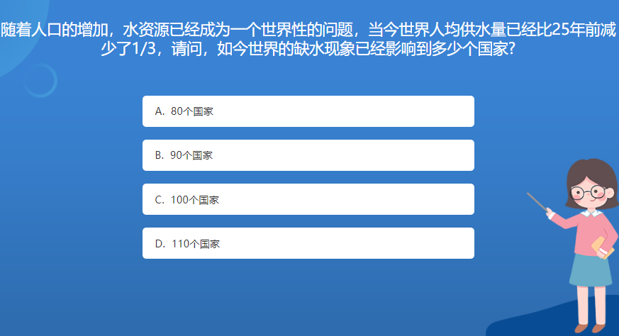 科普星空体育官网入口网站問答:隨著人口的增加,水資源已經成為一個世界性的問題,當今世界人均供水量已經比25年前減少了1/3,請問,如今世界的缺水現象已經影響到多少個國家?