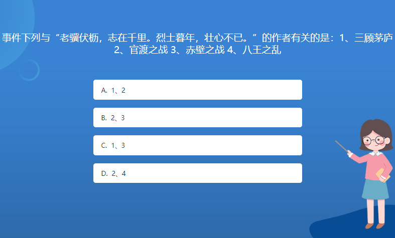 科普星空体育官网入口网站問答:事件下列與“老驥伏櫪,誌在千裏。烈士暮年,壯心不已。”的作者有關的是:1、三顧茅廬 2、官渡之戰 3、赤壁之戰 4、八王之亂